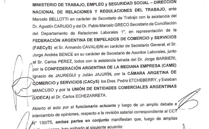 De la reunión llevada a cabo en el Ministerio de Trabajo participaron, además de Comercio y CAME, las autoridades de la Cámara Argentina de Comercio (CAC), la Unión de Entidades Comerciales Argentinas (UDECA), Carlos Pérez, titular de Osecac y secretario de Asistencia Social del SEC.