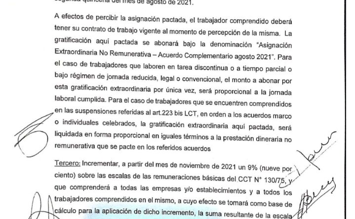 El acuerdo establece que en noviembre se pagaría un 9% extra y un bono por $4.000 durante la segunda quincena de agosto.